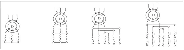圖1 單組接法(Y) 圖2 2組串聯(lián)接法(12Y) 圖3 二組并聯(lián)接法(21Y) 圖4 二串二并接法(22Y)