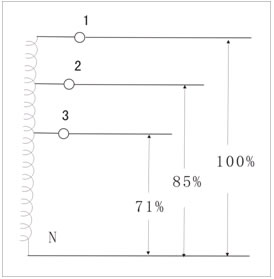 變阻器的繞組上設(shè)備4個抽頭,一個抽頭設(shè)在繞組的背面,編號為N,另外三個抽頭設(shè)在繞組的正面,抽頭1-N間為100%匝數(shù),抽頭2-N間,3-N之間分別為85%、71%匝數(shù),出廠時接線接在2N抽頭上即85%匝數(shù)。